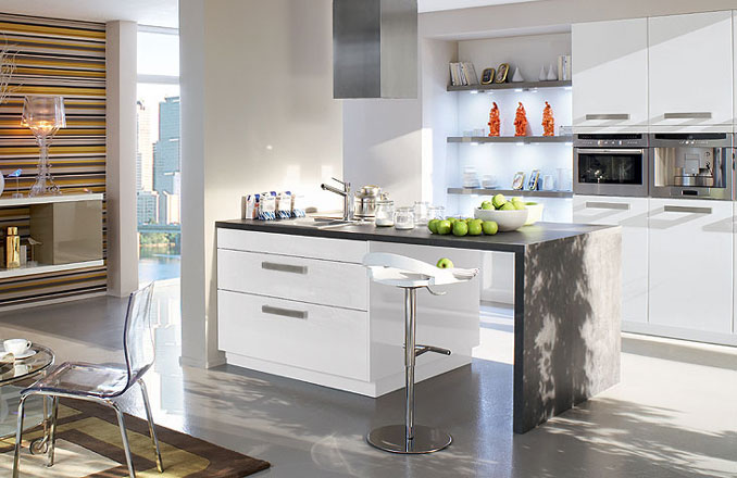 Ако имате по-голяма кухня или преходна кухня - хол, тип Open space, може да разположите в помещението така наречен кухненски остров. Това може да е по-висок шкаф, около който да са наредени бар-столчета или шкаф, в който да е вградена фурната или мивката. Ако пък кухнята не е толкова голяма, тогава може да използвате такъв кухненски остров със столчета вместо обичайната маса.
